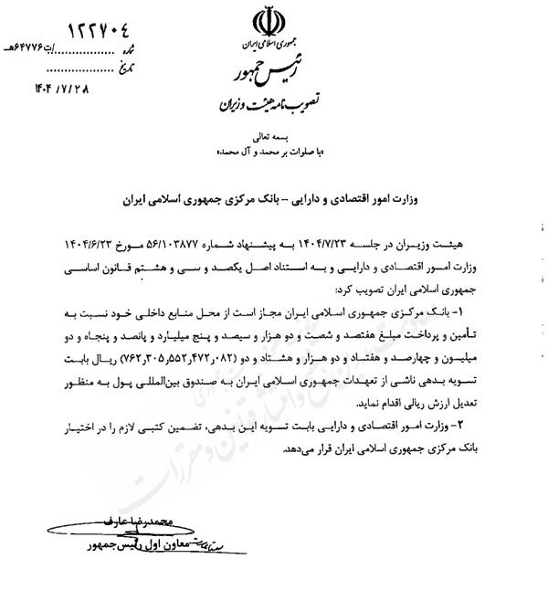 هیئت وزیران در جلسه مورخ ۲۳ شهریور ۱۴۰۴ به پیشنهاد وزارت اقتصاد به بانک مرکزی اجازه داد تا از محل منابع داخلی خود مبلغ ۷۶.۲ همت را برای تسویه بدهیهای جمهوری اسلامی ایران به صندوق بینالمللی پول پرداخت کند.
