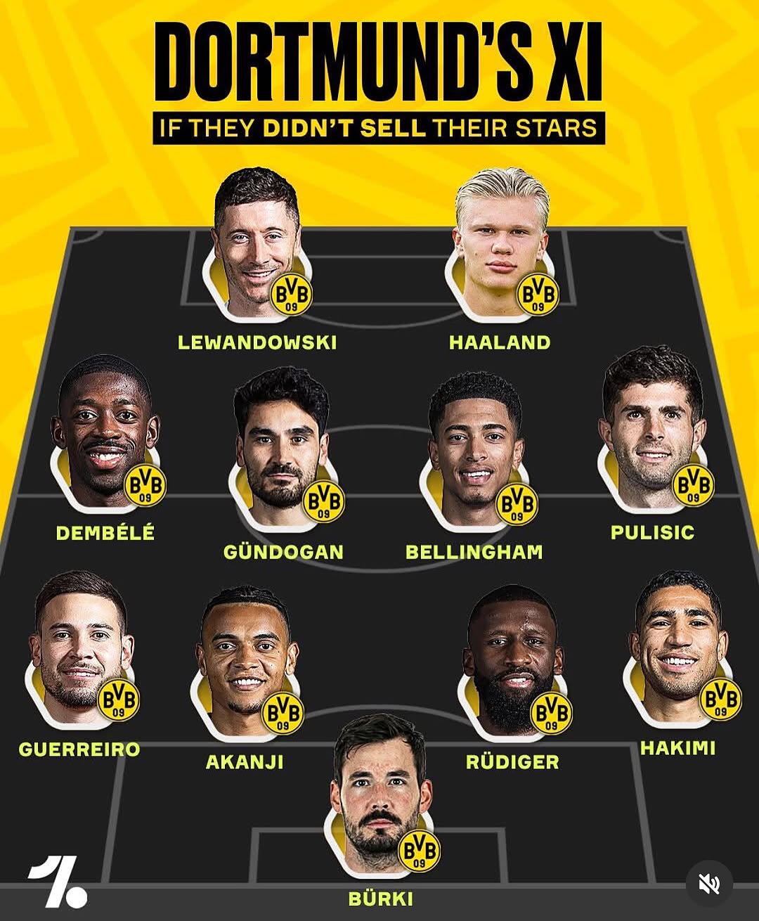 در این تصویر ترکیب رؤیایی باشگاه بوروسیا دورتموند را میبینیم؛ ترکیبی که اگر این تیم آلمانی ستارههای خود را نمیفروخت، شاید امروز یکی از قدرتمندترین تیمهای تاریخ فوتبال اروپا بود. عنوان تصویر «Dortmund’s XI if they didn’t sell their stars» بهمعنای «ترکیب دورتموند اگر ستارههایش را نمیفروخت» است و همین جمله نشان میدهد که چه استعدادهای بزرگی از این باشگاه عبور کردهاند.