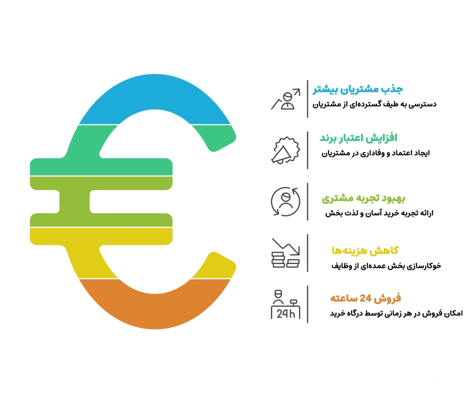 | مزایای کسبوکار آنلاین | دسترسی به مشتریان بیشتر، افزایش اعتبار برند، بهبود تجربه خرید، کاهش هزینهها و امکان فروش ۲۴ ساعته. |