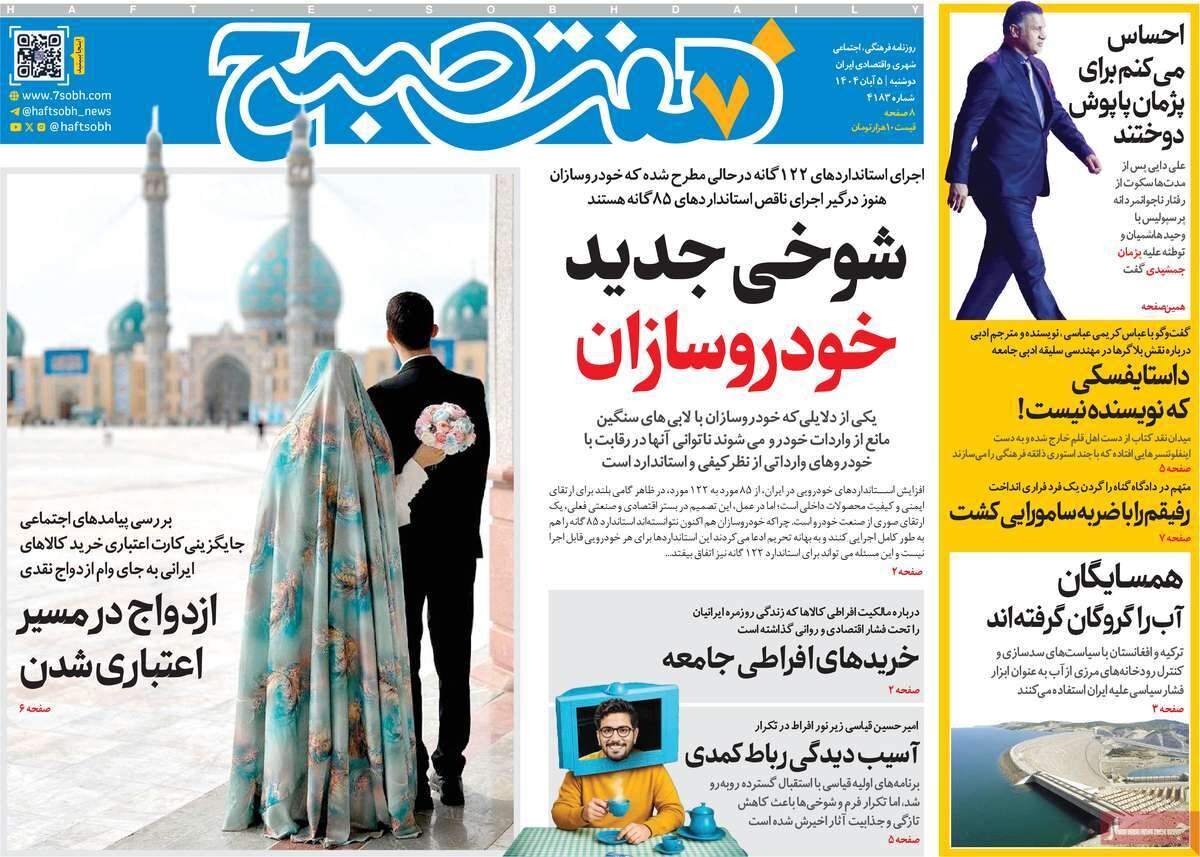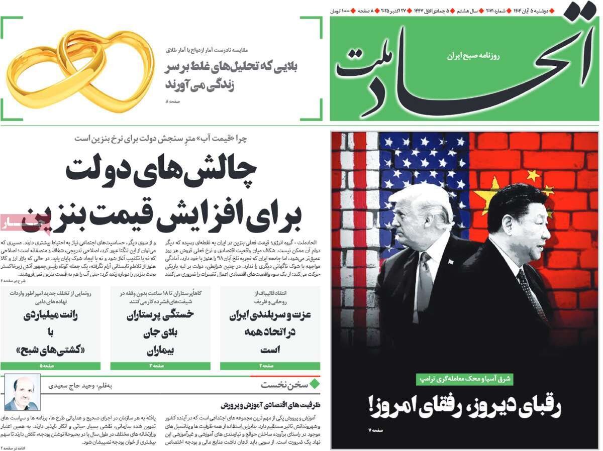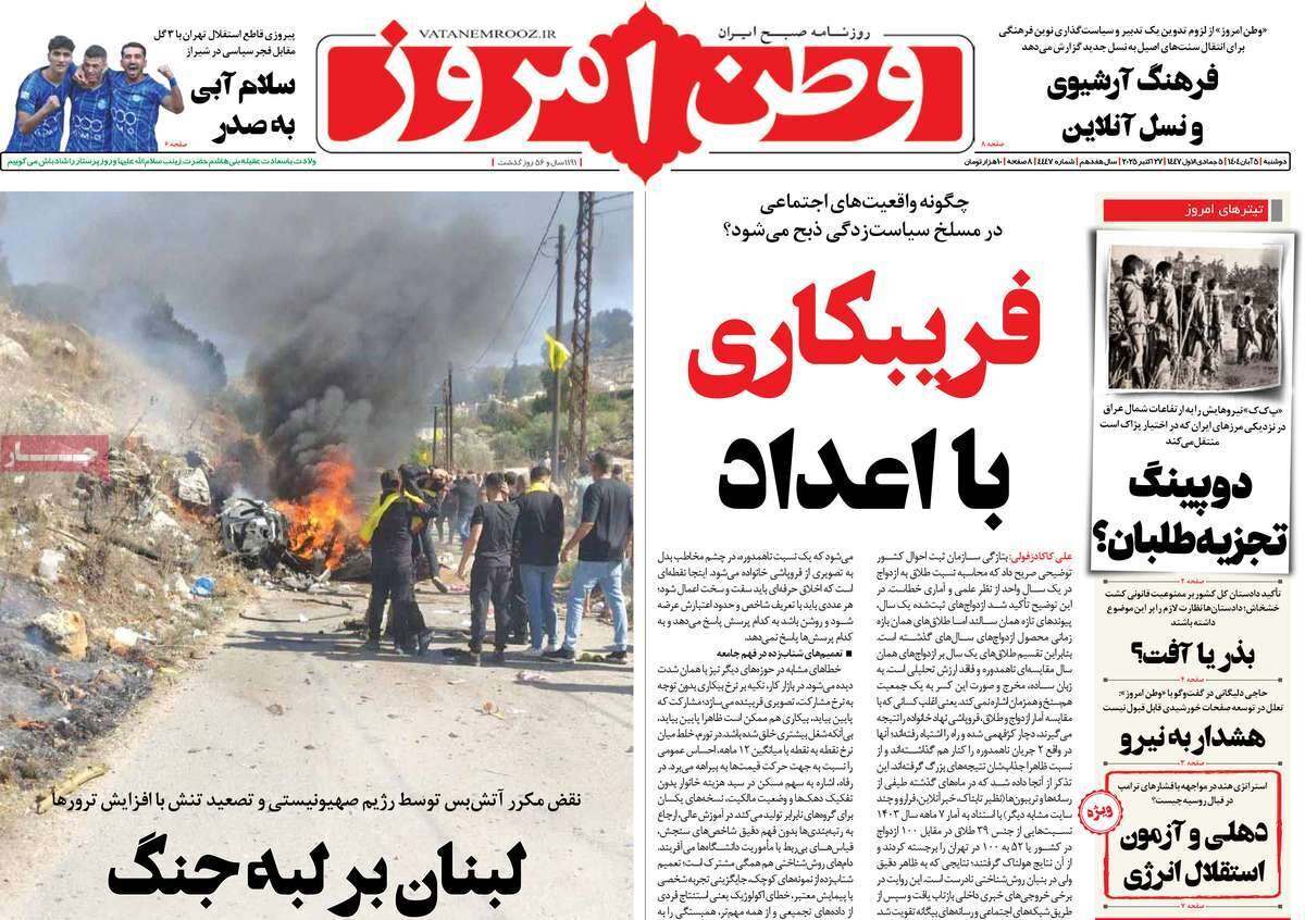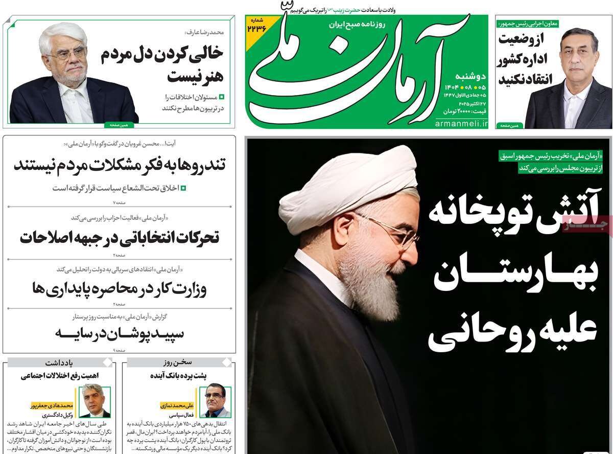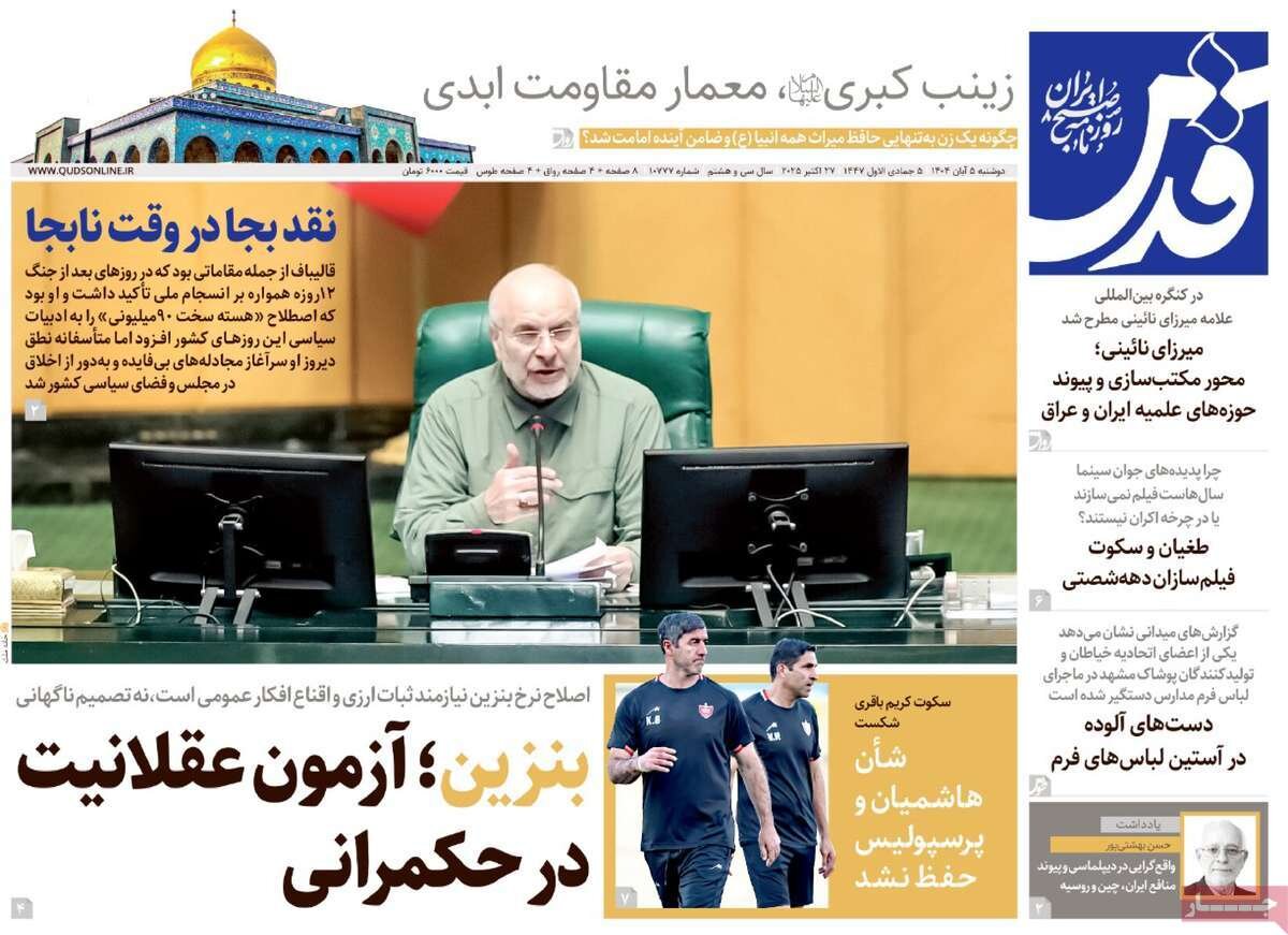 دوشنبه ۵ آبان ۱۴۰۴ - ۰۹:۵۷ شناسهٔ خبر: 75529200 - سرویس سیاسی نسخه قابل چاپ منبع: مهر | لینک خبر روزنامههای صبح دوشنبه پنجم آبان ۱۴۰۴ روزنامه های صبح امروز درباره بازتاب سخنان قالیباف در صحن علنی مجلس شورای اسلامی نوشتند. صاحبخبر - ∎
