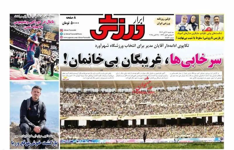 سهشنبه ۶ آبان ۱۴۰۴ - ۰۷:۴۶ شناسهٔ خبر: 75544928 - سرویس ورزشی نسخه قابل چاپ منبع: افکارنیوز | لینک خبر هاشمیان : فسخ نمیکنم کل پولم را می خواهم/پیشخوان صفحه اول روزنامه های ورزشی امروز سه شنبه 6 آبان را در زیر بخوانید. صاحبخبر - صفحه اول روزنامه های ورزشی امروز سه شنبه 6 آبان را در زیر بخوانید. ∎