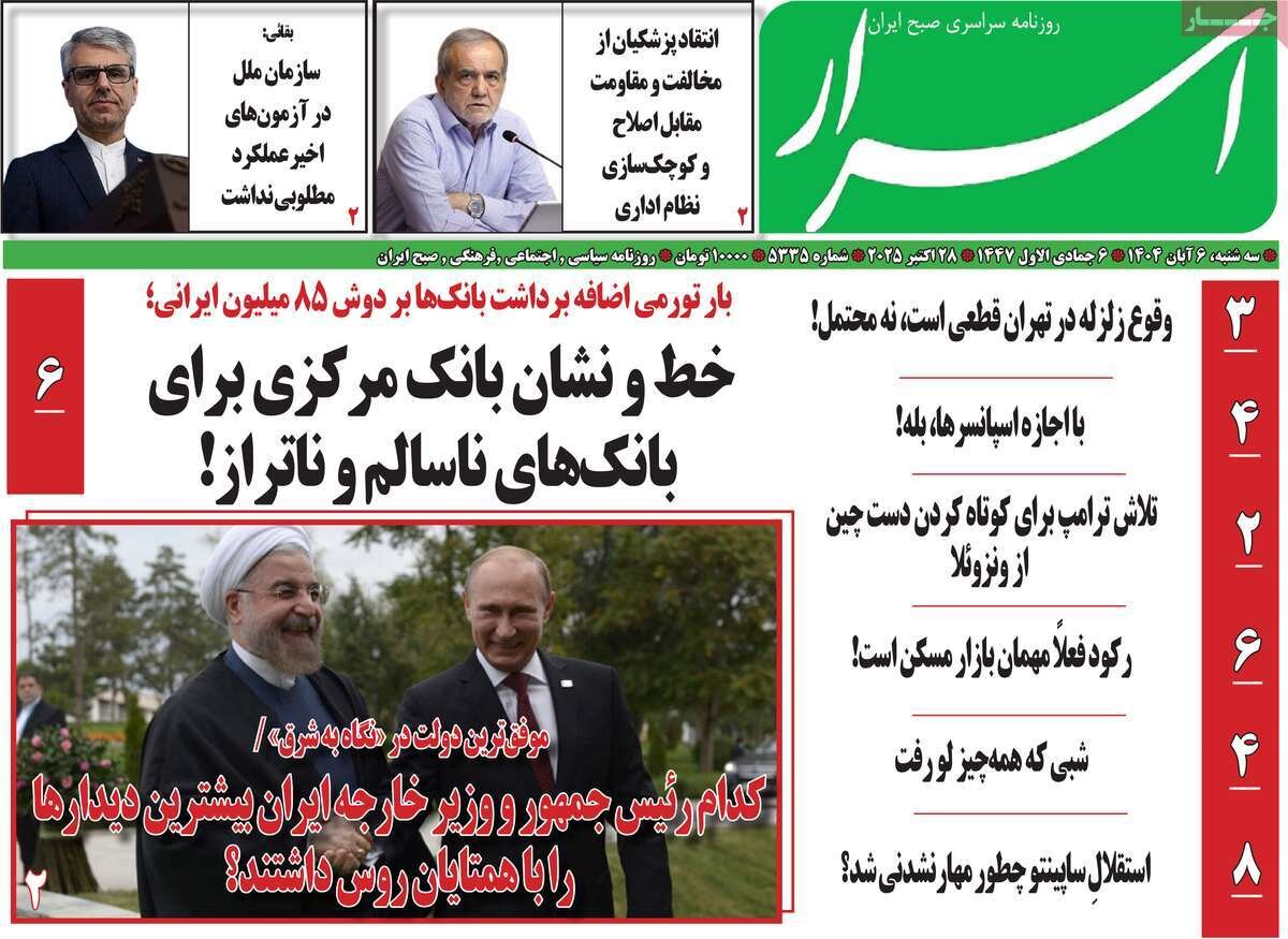 سهشنبه ۶ آبان ۱۴۰۴ - ۰۹:۳۸ شناسهٔ خبر: 75546527 - سرویس سیاسی نسخه قابل چاپ منبع: مهر | لینک خبر روزنامههای صبح سهشنبه ششم آبان ۱۴۰۴ روزنامه های صبح امروز درباره موضوعات روز اجتماعی و سیاسی نوشتند. صاحبخبر - ∎
