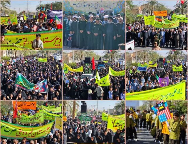 در این مراسم، جمع زیادی از دانشآموزان، روحانیون، فرهنگیان و خانوادهها با در دست داشتن پرچمهای ایران و پلاکاردهای اعتراضی، با شعارهای ضد استکباری، بار دیگر بر پایبندی خود به آرمانهای انقلاب اسلامی تأکید کردند.