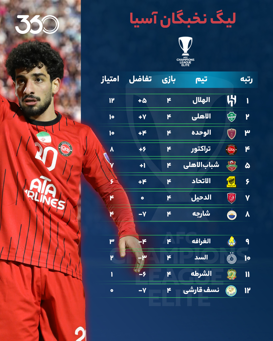 شبابالاهلی در هفته چهارم لیگ نخبگان شکست دور از انتظاری را متحمل شد و با نتیجه 4 بر یک به الدحیل باخت تا نامش از بین تیمهای بدون باخت فصل جدید لیگ نخبگان کنار برود و به رتبه پنجم جدول هم با 7 امتیاز سقوط کرد. در این بین باید به اوجگیری الاتحاد هم اشاره داشت؛ تیمی که در حضور کریم بنزما و با گلزنی او، برد بیدردسری را برابر شارجه در این هفته از رقابتها بهدست آورد و پس از کسب پیروزی 4 بر یک مقابل الشرطه، 3 گل هم به حریف اماراتی زد تا در مسیر رسیدن به مرحله حذفی خودش را به جایگاه ششم جدول برساند.
