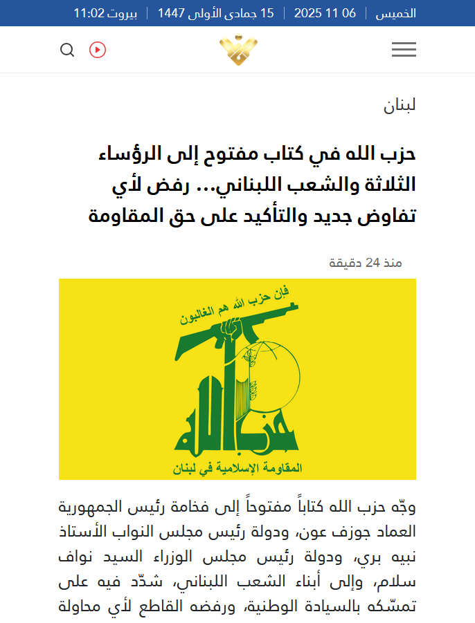 حزبالله تأکید کرد: «در شرایط کنونی، کشور نباید فریب مذاکرات جدید را بخورد؛ زیرا اینگونه مذاکرات تنها امتیازات بیشتری را برای دشمن فراهم میآورد، در حالی که او هرگز به تعهداتش پایبند نبوده و چیزی نمیدهد.»