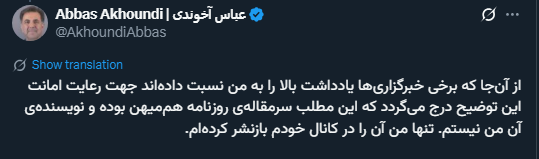 توضیح: این سرمقاله در رسانهها و از جمله حساب کاربری آقای عباس آخوندی و به عنوان یادداشت ایشان در روزنامه هممیهن منتشر شده بود که پس از انتشار گزارش مشرق، طی توضیحاتی آن را در حساب کاربری خود اصلاح کردند.