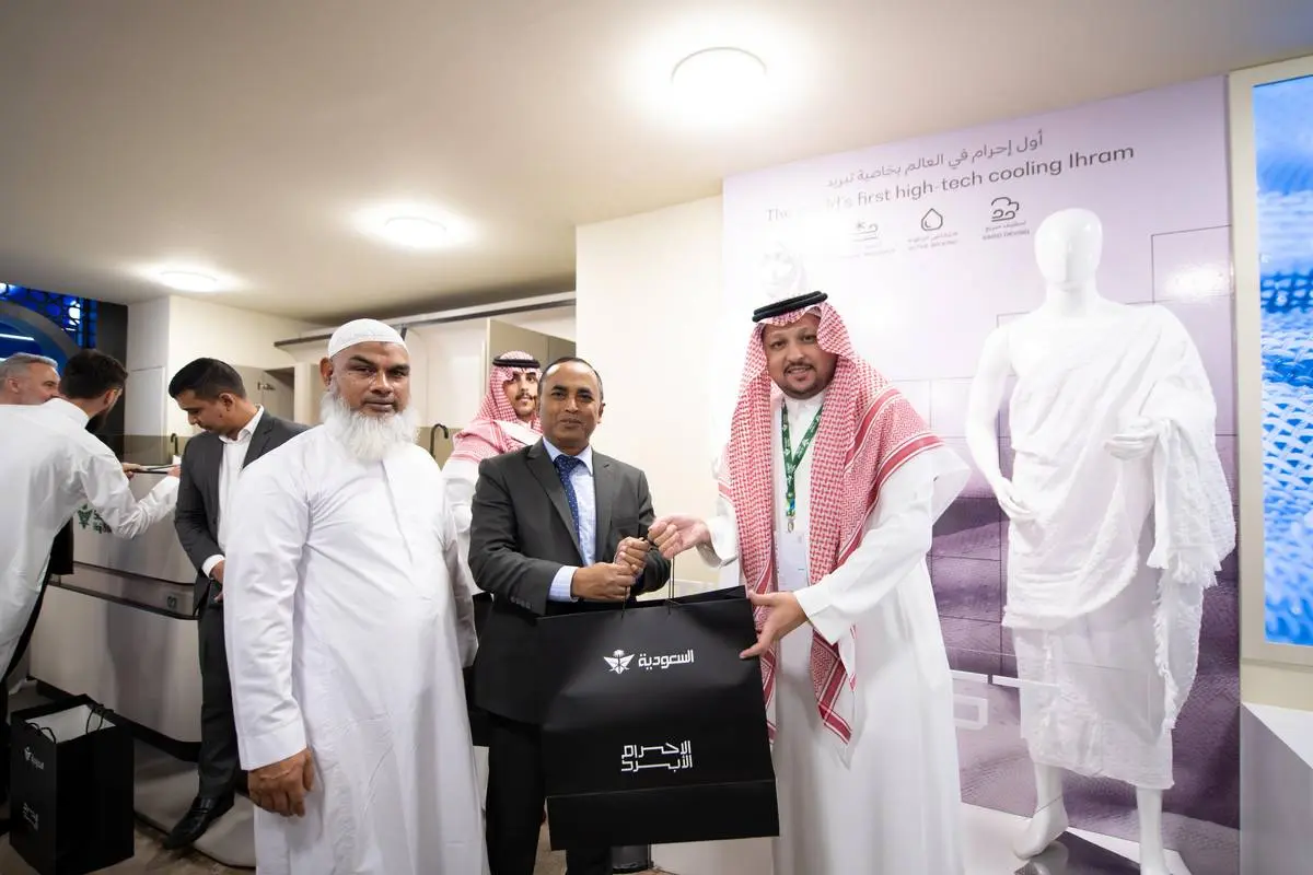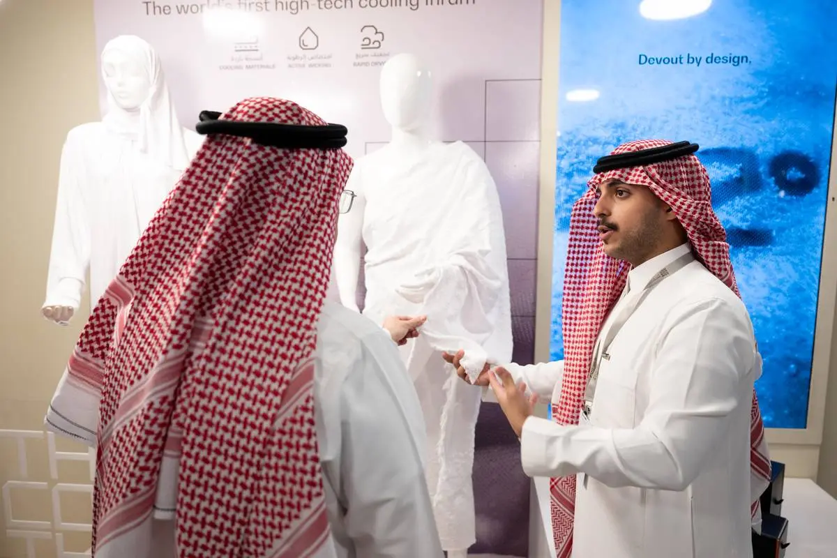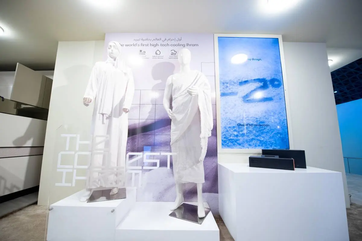 غرفه هواپیمایی عربستان سعودی در نمایشگاه حج ۲۰۲۵، لباس ویژهای برای احرام عرضه کرده که در آن از فناوری خنککننده استفاده شده است.