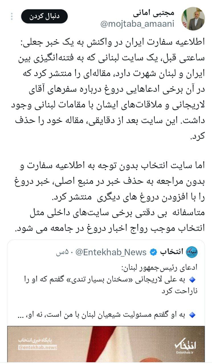 گروه سیاست-رجانیوز: درحالیکه شبکه خبری المیادین«به نقل از منابع آگاه در دبیرخانه شعام جوابیهی تندی به اظهارات منتسب به رئیسجمهور درباره محتوای دیدار با علی لاریجانی» منتشر کرد، سفیر ایران در لبنان، خبر منتشر شده را جعلی معرفی و نوشت: «یک سایت لبنانی که به فتنهانگیزی بين ایران و لبنان شهرت دارد، مقالهای را منتشر کرد که در آن برخی ادعاهایی دروغ درباره سفرهای آقای لاریجانی و ملاقاتهای ایشان با مقامات لبنانی وجود داشت. این سایت بعد از دقایقی، مقاله خود را حذف کرد.»!