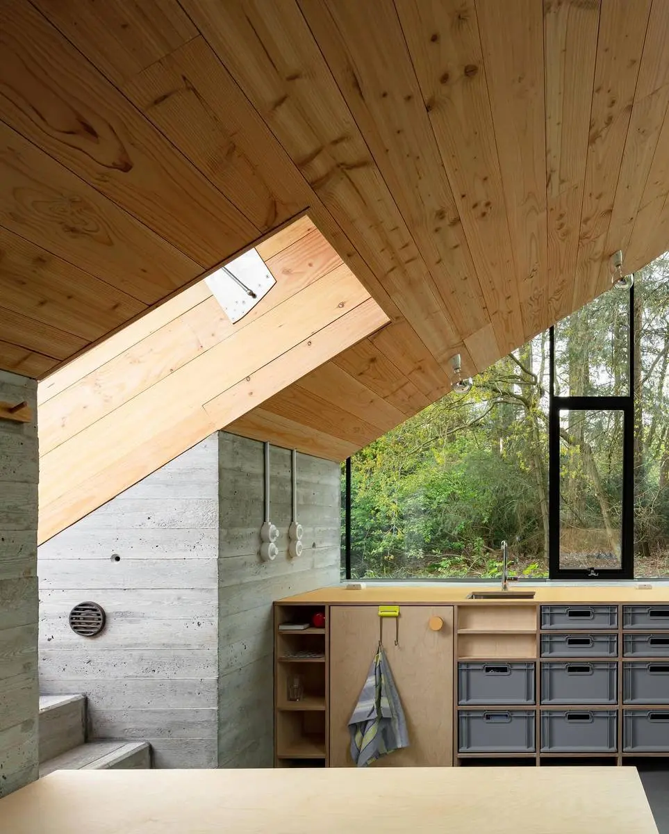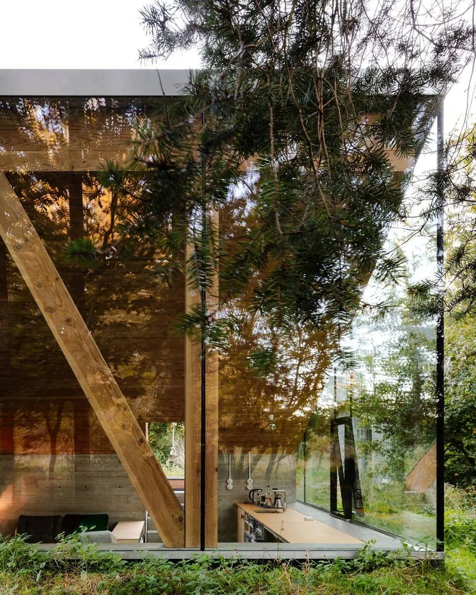 یک ستون شیب‌دار به شکل منحصر به فردی از میان سقف سبز عبور کرده و علاوه بر نقش سازه‌ای، فضاهایی برای لانه‌سازی پرندگان و خفاش‌ها ایجاد می‌کند. این عنصر به بهترین شکل ممکن، معماری را با طبیعت پیوند می‌زند و مفهوم زندگی کوچک و سازگار با محیط زیست را به نمایش می‌گذارد.
