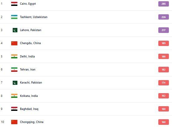 قاهره (مصر)، تاشکند (ازبکستان)، لاهور (پاکستان)، چنگدو (چین)، دهلی (هند)، تهران (ایران)، کراچی (پاکستان)، کلکته (هند)، بغداد (عراق) و چونگچینگ (چین).همچنین از این ۱۰ شهر ذکر شده، قاهره، تاشکند و لاهور در وضعیت بسیار ناسالم و بقیه شهرها نیز در وضعیت ناسالم قرار دارند.
