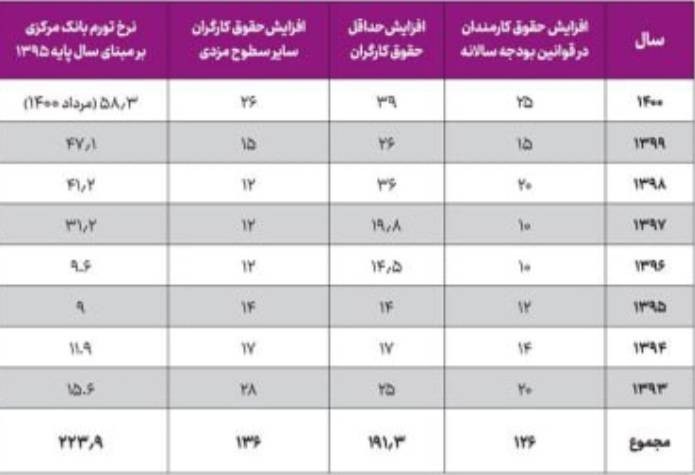 این در حالی است که مجموع نرخ تورم در 8 سال دولت روحانی با احتساب نرخ تورم مرداد 1400 به عنوان ماه پایانی آن دولت، 223.9 درصد بود. بنابراین حقوق کارمندان در 8 سال دولت حسن روحانی 97.9 درصد کمتر از تورم افزایش یافت. میزان عقبماندگی حداقل حقوق کارگران از تورم 8 ساله 32.6 درصد و حقوق کارگران در سایر سطوح هم 87.9 درصد بود.