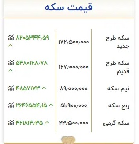 در بازار مسکوکات، شدت نوسانات حتی محسوستر از بازار آبشده بود. سکه تمام بهار آزادی طرح جدید (امامی) که همواره پیشران نوسانات بازار سکه است، با ثبت رشدی نزدیک به ۵ درصد (۴.۹۹ درصد)، جهشی ۸ میلیون و ۲۰۵ هزار تومانی را تجربه کرد و به رقم ۱۷۲,۵۰۰,۰۰۰ تومان رسید. سکه طرح قدیم نیز با وجود نوسان کمتر نسبت به طرح جدید، با افزایش ۵ میلیون و ۴۸۰ هزار تومانی، کانال ۱۶۷ میلیون تومان را فتح کرد.