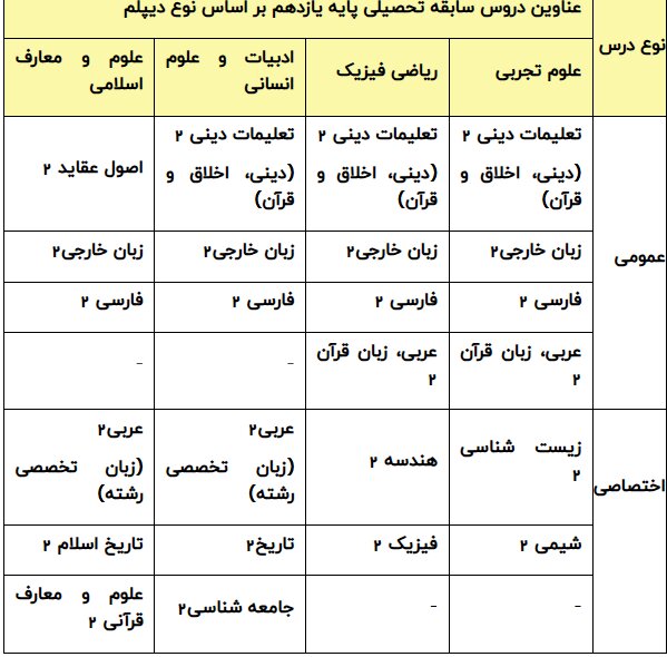 عناوین دروس سابقه تحصیلی پایه یازدهم برای هر یک از دیپلم ها در آزمون سراسری سال ۱۴۰۵ همانند آزمون سراسری سال ۱۴۰۴ به شرح جدول ذیل است: