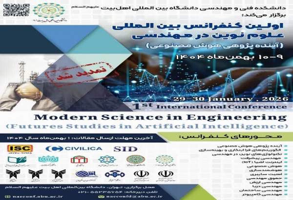 نخستین کنفرانس بین‌المللی «علوم نوین در مهندسی»، با محوریت تخصصی آینده‌پژوهی هوش مصنوعی، توسط دانشکده فنی و مهندسی دانشگاه بین‌المللی اهل‌بیت(ع) در تاریخ ۹ و ۱۰ بهمن‌ماه ۱۴۰۴ به‌صورت مجازی برگزار می‌شود.