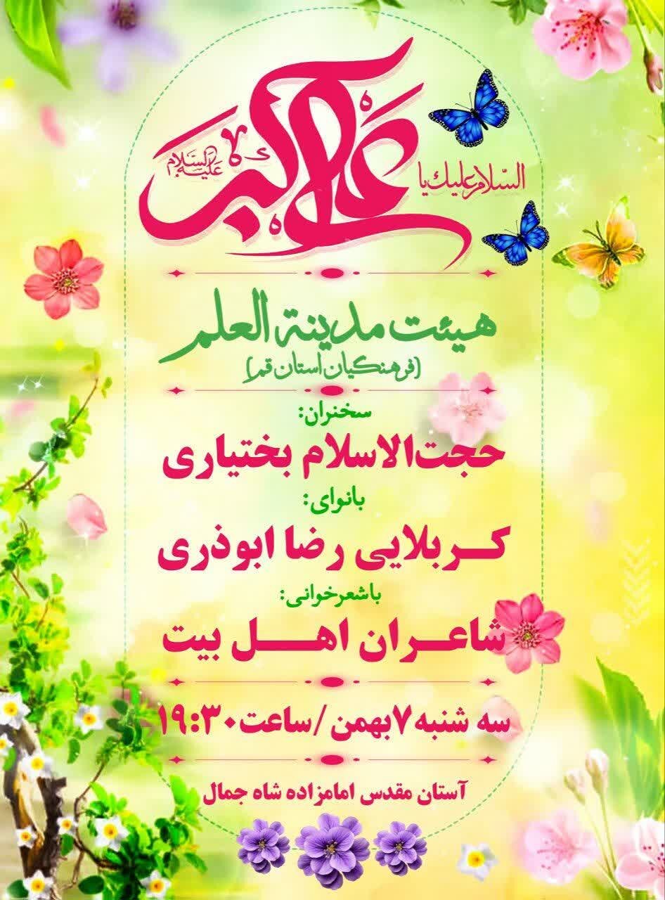 این ویژه برنامه شامل سخنرانی حجتالاسلام بختیاری، مدیر مرکز تعالی مدارس صدرا و مداحی کربلایی رضا ابوذری خواهد بود.