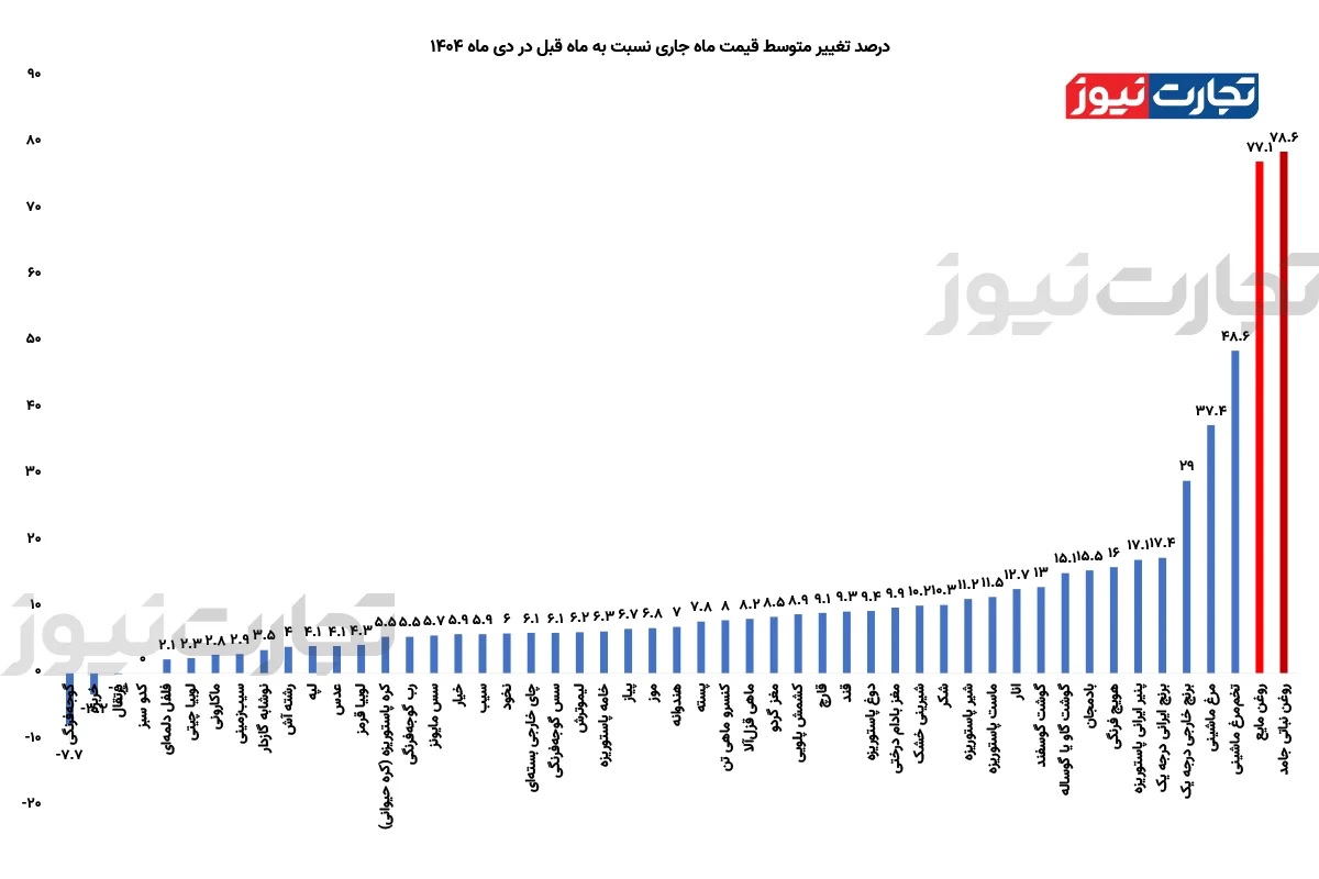 به گزارش تجارت نیوز، در صدر افزایش قیمت سبد غذایی خانوارها، روغنهای خوراکی قرار دارند؛ بهطوریکه قیمت روغن نباتی جامد در دیماه نسبت به آذر، ۷۸.۶درصد و روغن مایع ۷۷. درصد افزایش یافته است؛ ارقامی که حتی در مقایسه با ماههای پرنوسان سال جاری نیز بیسابقه محسوب میشود.پس از روغن، بازار پروتئین و اقلام پایه غذایی نیز با جهش قابل توجهی مواجه شده است. قیمت تخممرغ ماشینی در یک ماه ۴۸.۶ درصد افزایش یافته و مرغ ماشینی رشد ۳۷.۴ درصدی را ثبت کرده است. برنج خارجی درجه یک نیز با افزایش ۲۹ درصدی و برنج ایرانی درجه یک با رشد ۱۷.۴ درصدی، بار دیگر به یکی از عوامل اصلی فشار بر هزینههای خانوار تبدیل شدهاند.