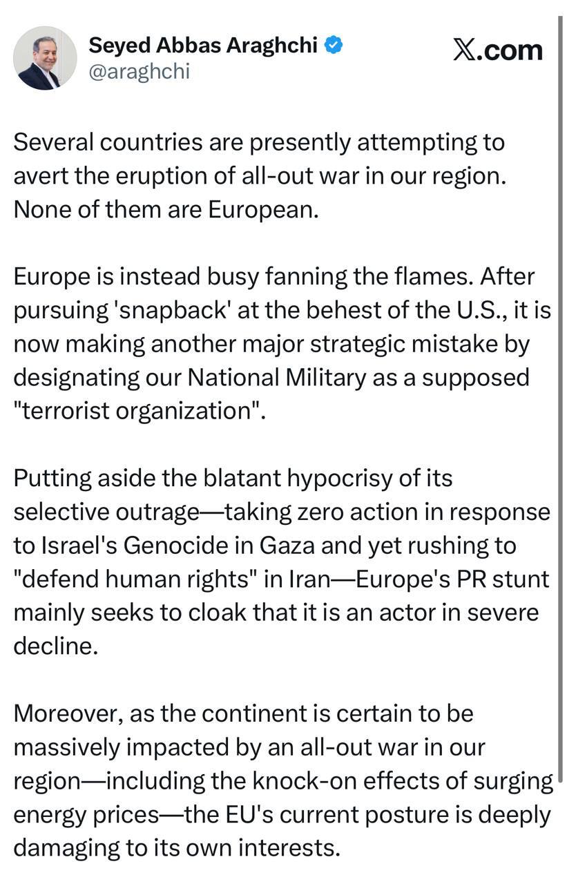 در مقابل، اروپا سرگرم دمیدن در آتش بحران است. پس از پیگیری سازوکار «اسنپبک» به درخواست ایالات متحده، اکنون با قرار دادن نیروهای مسلح ما در فهرست بهاصطلاح «سازمانهای تروریستی»، مرتکب یک اشتباه راهبردی بزرگ دیگر شده است.