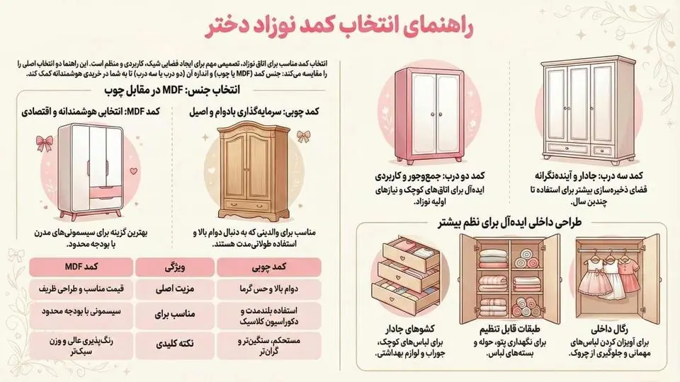 انتخاب کمد نوزاد دختر زمانی بهترین نتیجه را میدهد که فضای اتاق، بودجه و نگاه بلندمدت را همزمان در نظر بگیرید. کمد MDF با طراحی ظریف و قیمت مناسب، انتخابی هوشمندانه برای بیشتر سیسمونیهاست و کمد چوبی برای استفاده طولانیمدت گزینهای ماندگار محسوب میشود. تقسیمبندی داخلی کاربردی هم تضمینکننده نظم و آرامش اتاق نوزاد است.