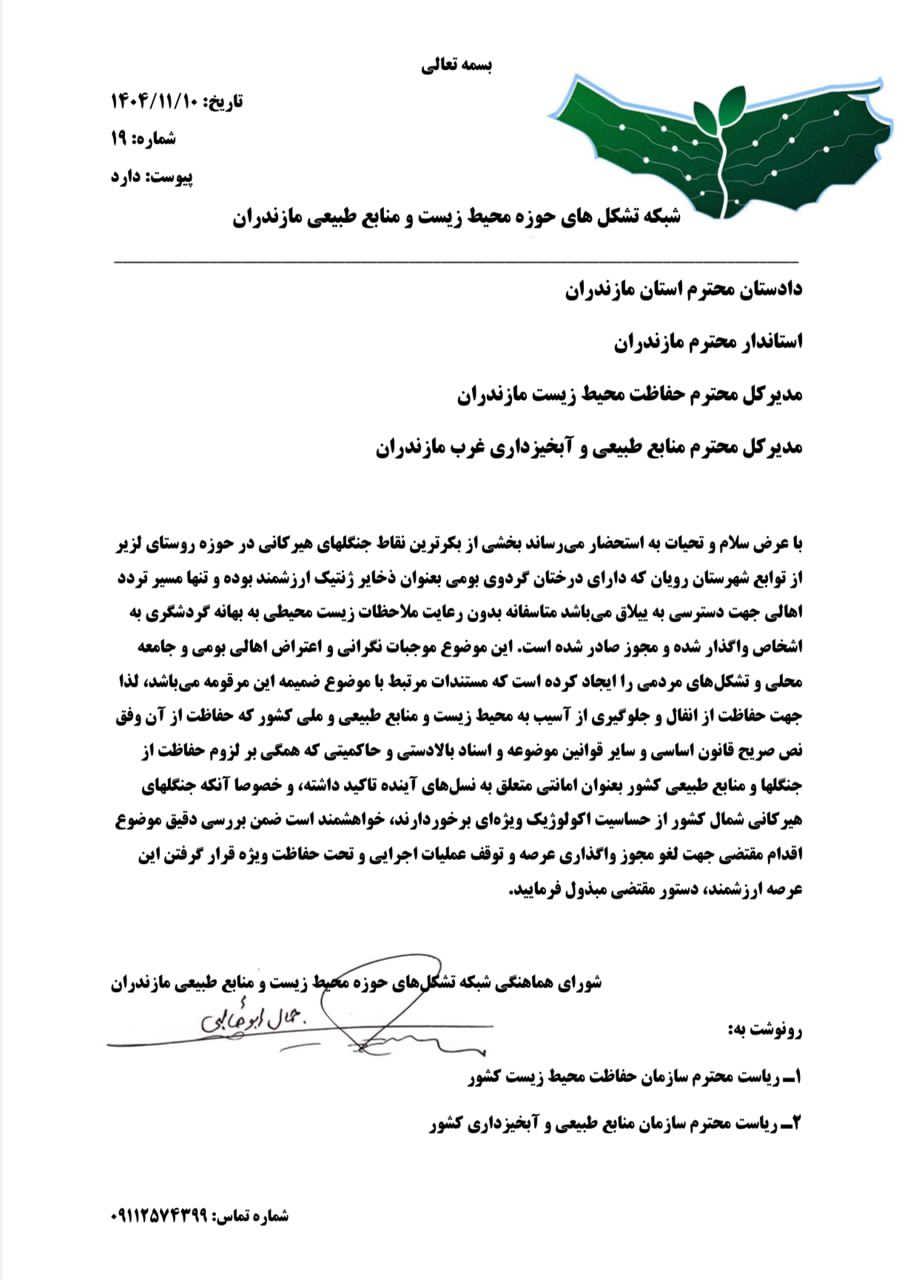 لذا جهت حفاظت از انفال و جلوگیری از آسیب به محیط زیست و منابع طبیعی وملی کشور که حفاظت از آن وفق نص صریح قانون اساسی و سایر قوانین موضوعه و اسناد بالادستی و حاکمیتی که همگی بر لزوم حفاظت از جنگل ها ومنابع طبیعی کشور به عنوان امانتی متعلق به نسل های آینده تاکید داشته، و خصوصا آنکه جنگل های هیرکانی در شمال کشور از حساسیت اکولوژیک ویژه ای برخوردارند، خواهشمند است ضمن بررسی دقیق موضوع، اقدام مقتضی جهت لغو مجوز واگذاری عرصه و توقف عملیات اجرایی و تحت حفاظت ویژه قرار گرفتن این عرصه ارزشمند دستور مقتضی مبذول فرمایید.