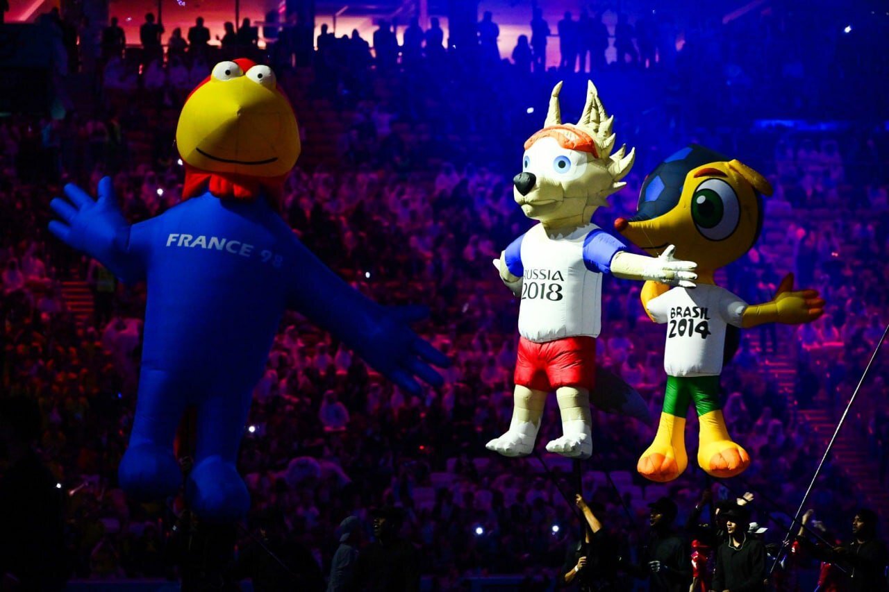 * بعد از جشنهای ابتدایی، نوبت به مسکات (عروسکهای نمادین ادوار جام جهانی) دورههای مختلف رسید و در ادامه «لعیب» نماد قطری که طراح آن ایرانی است، در ورزشگاه به پرواز درآمد.
